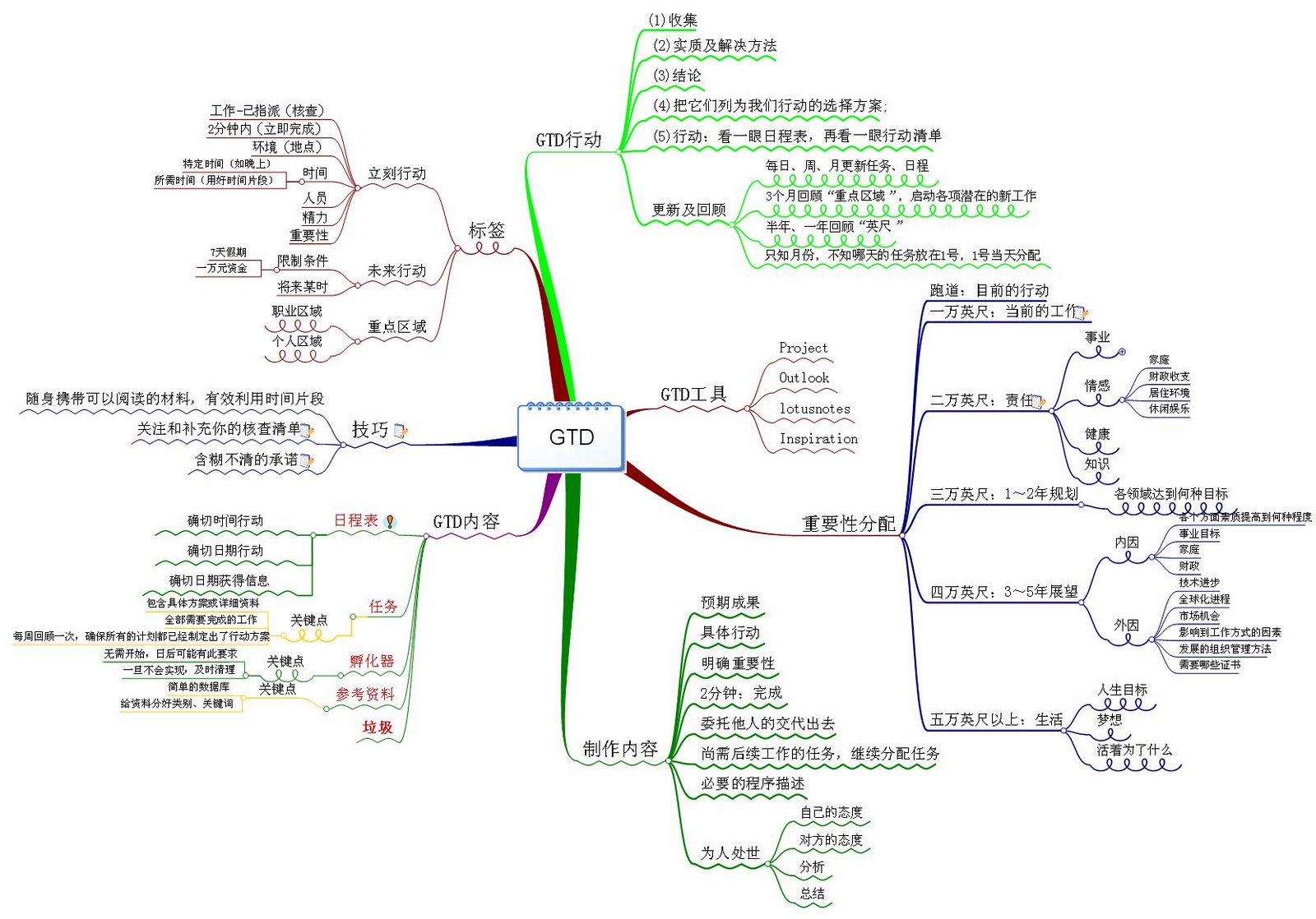 GTD的基本方法:GTD的具体做法可以分成收集、整理、组织、回顾与执行五个步骤。