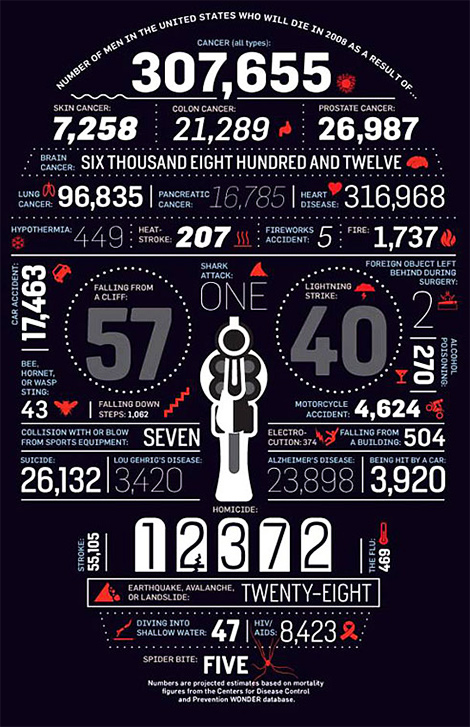 一张很有意思的图,巨大的骷髅是由一连串真实的数据组成,数据来自疾病控制和预防数据库,癌症依然是人类的第一杀手,除了各种疾病,还包括高楼坠落,闪电,从楼梯落下,以及1例被鲨鱼攻击。